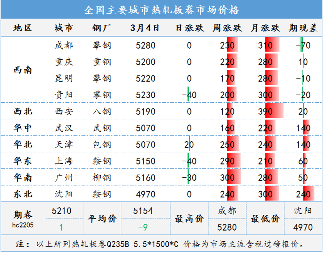 近期俄乌冲突加剧,国际大宗商品价格普涨,带动国内期货市场大幅上涨;铁矿、焦炭等原料价格持续上涨,市场炒作情绪进一步升温;目前正值“两会”敏感时间窗口,市场对利好政策存在预期,加之各地重大项目工程集中开工,对市场信心支撑较强,本周全国钢材市场大幅上涨。总体看,近期国际形势复杂多变,资本市场的频繁波动,对现货引导作用明显。